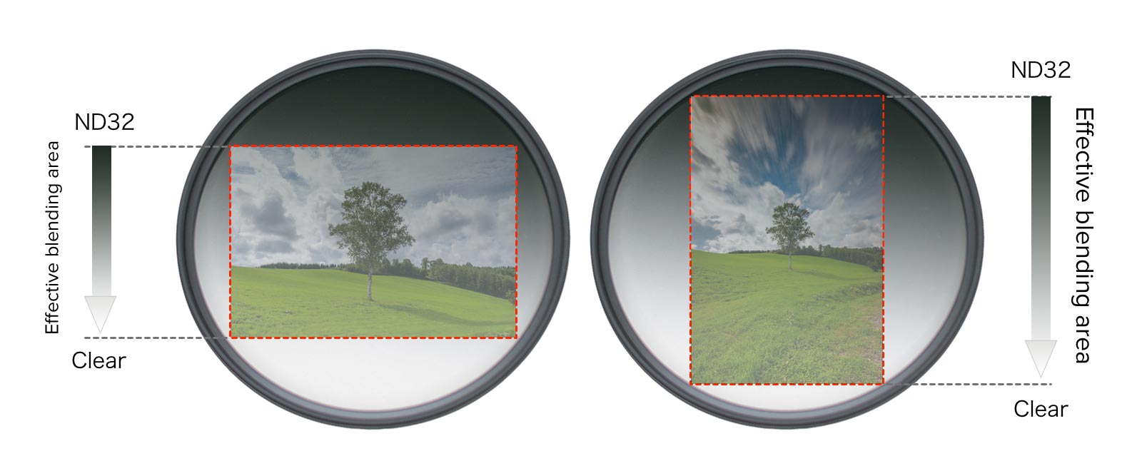 Der PROND GRAD verwendet eine ND-Abscheidungstechnologie, die eine gleichmäßige Verteilung der Gradation über die gesamte Filterglasoberfläche ermöglicht. Um jedoch den wahren Dichtewert innerhalb des Bildbereichs zu erhalten, haben wir den effektiven Überblendungsbereich so angepasst, dass die angegebene Dichte innerhalb dieses Bildbereichs beginnt und abklingt. Das hilft den Fotografen, die gewünschte Dichte auf die effektivste Weise auf das Bild anzuwenden.